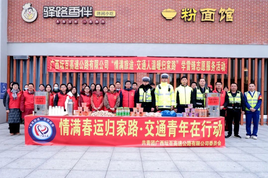 1月26日,春运启动首日,五洲彩虹桥志愿服务队坛百分队“情满旅途 交通人温暖归家路”学雷锋志愿服务活动在坛百高速各服务区、收费站拉开序幕。坛百公司党员、团员、志愿者统一穿上红马甲、佩戴“青年文明号”绶带,主动亮明身份,为过往群众送上热茶、递上新春礼品、提供路线指引和路况信息、普及安全行车知识……