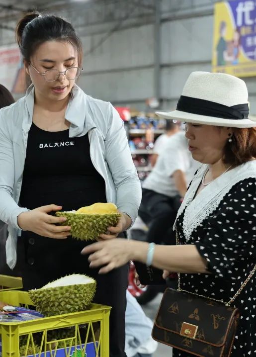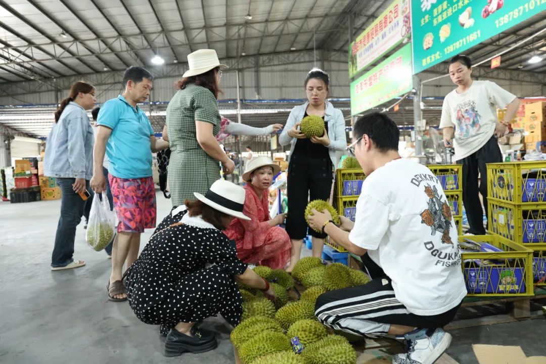▲市民、游客在万通物流园水果零售区采购榴莲。