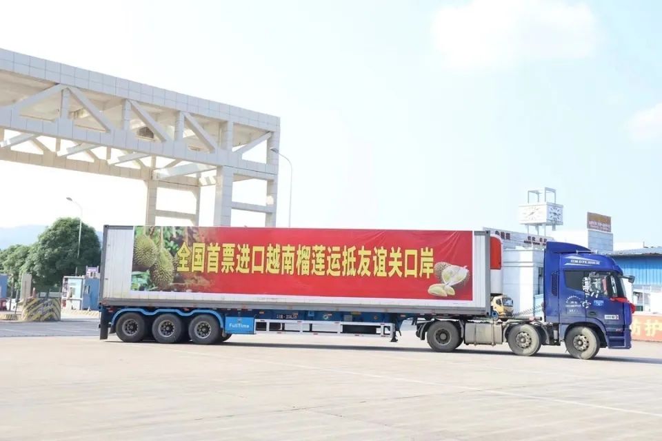 6月5日上午11点,一辆满载越南榴莲的越南籍货车顺利从友谊关口岸通关后进入万通物流园驳接,开启了中国市场的旅程。随着新一季东南亚水果成熟期的到来,榴莲也迎来了进口旺季。