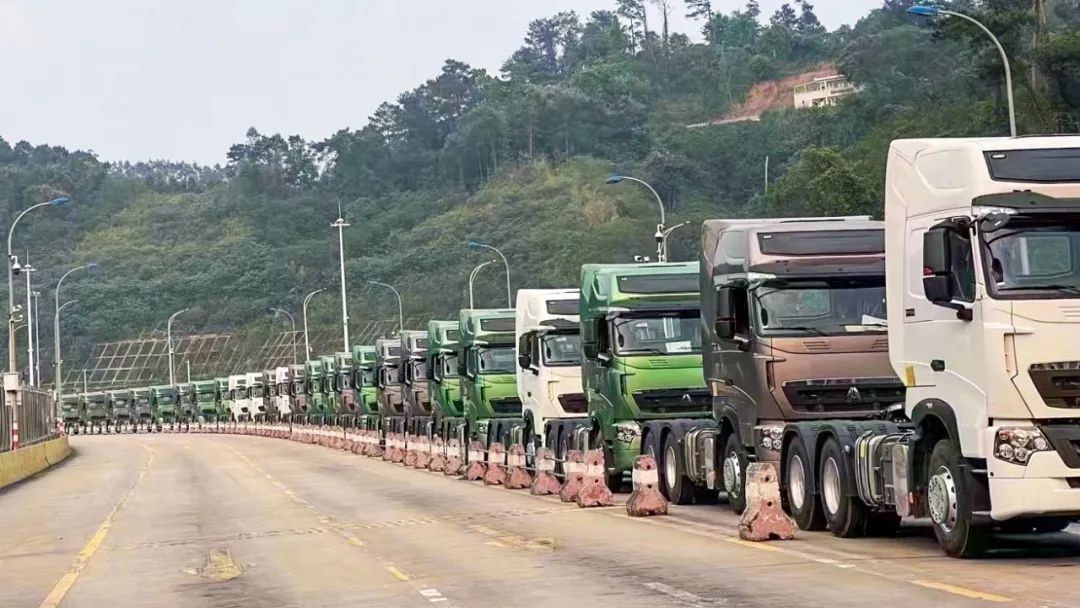 ▲2月20日,由万通报关行报关的76辆新车在友谊关口岸外整装待发。